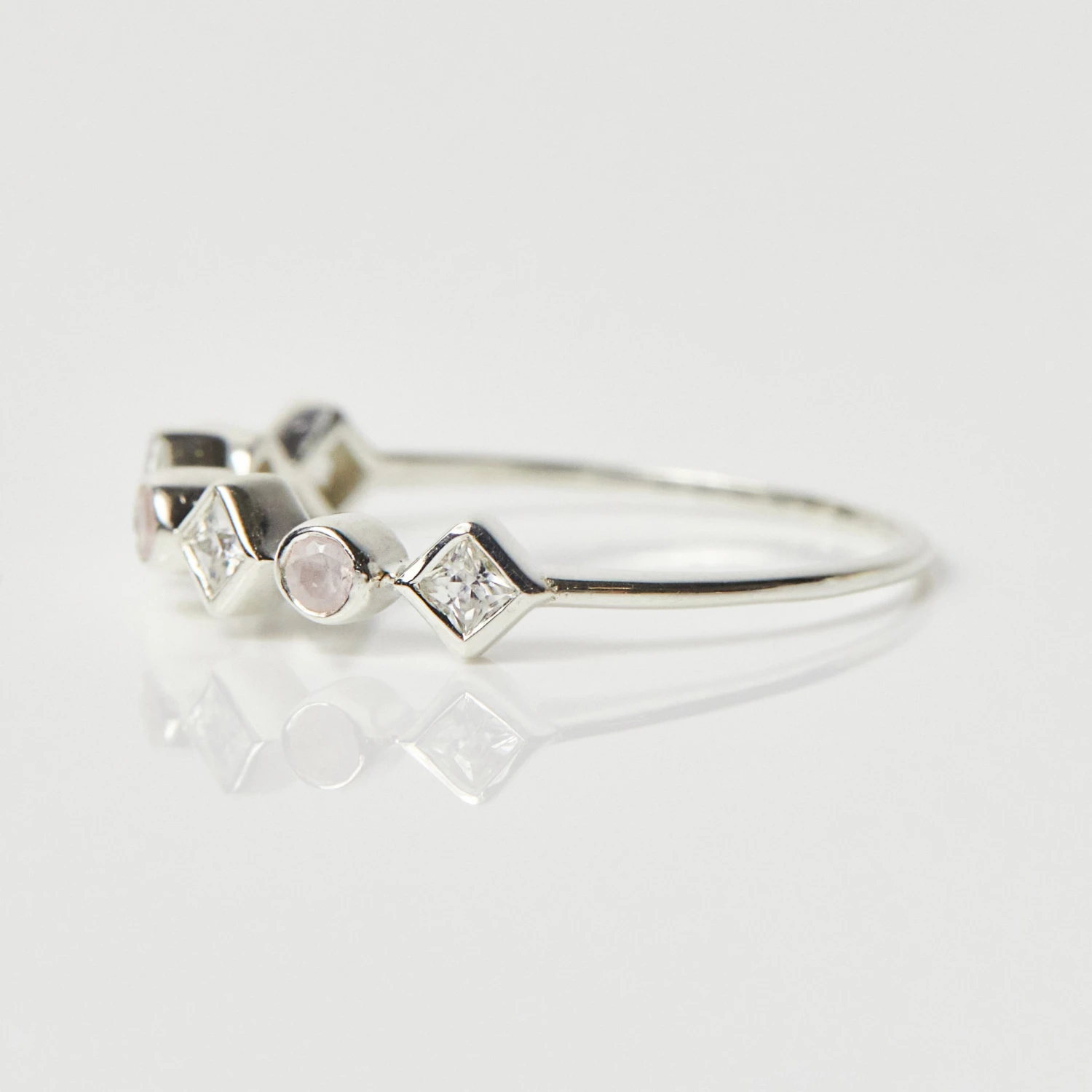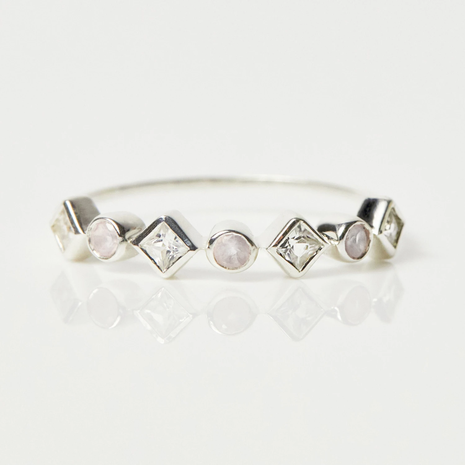 Sparkling pink and white tones of Rose quartz and Cubic zirconia make up this perfect stacking ring!