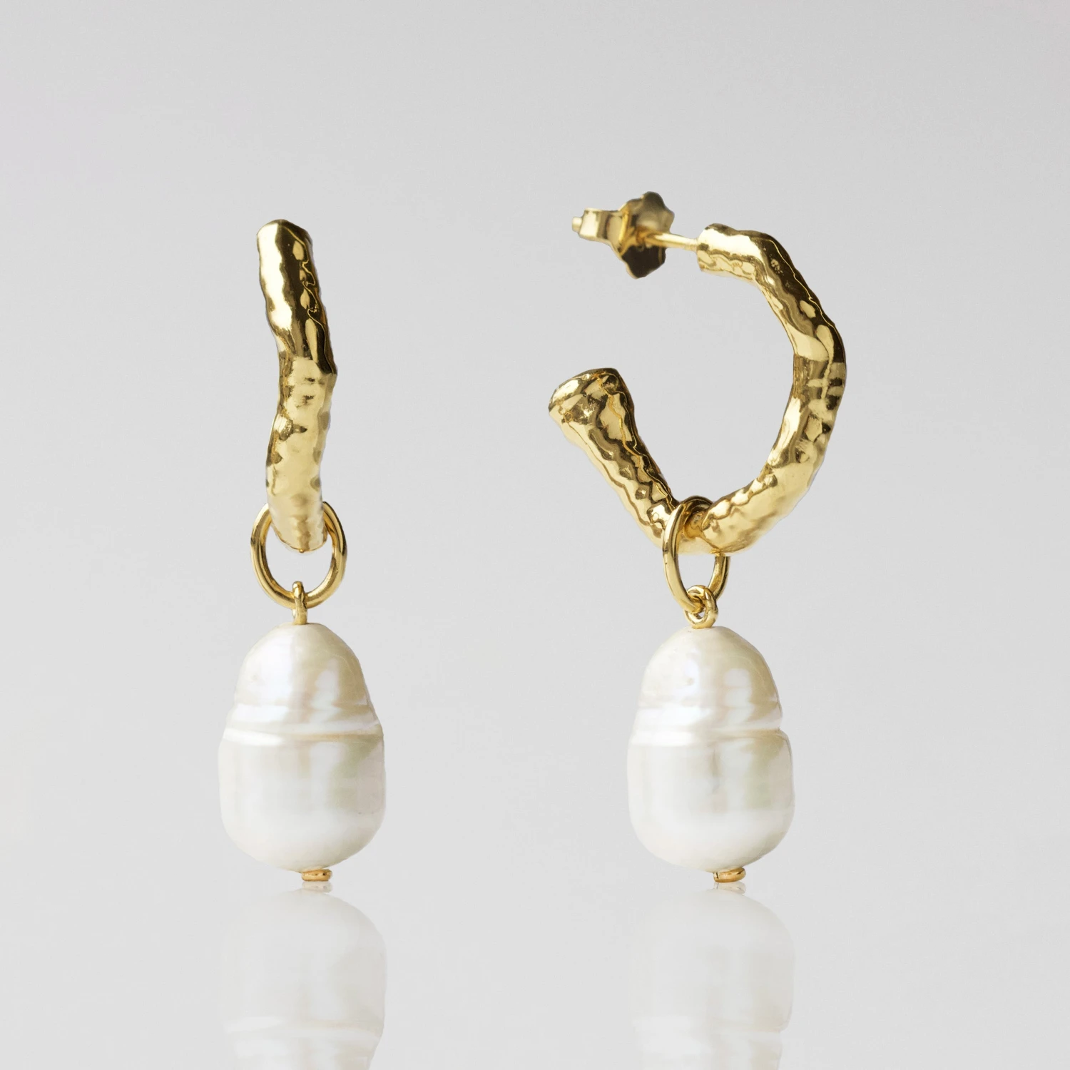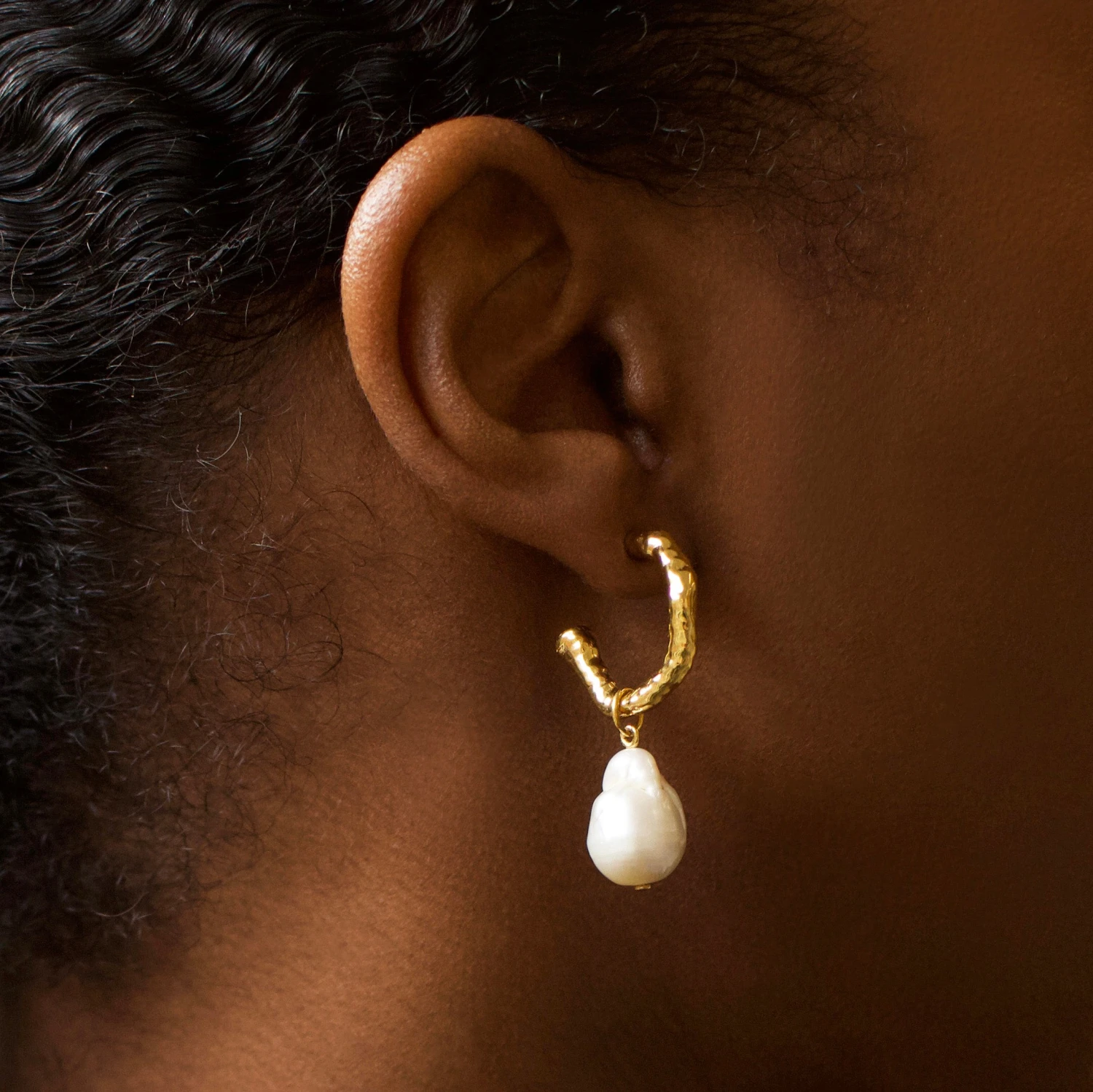 Enveloped in molten texture and beautifully organic in shape, these luxe hoops with baroque pearl drops add elevated details to a jewellery box classic. Even better you can remove the pearl and wear these as a statement gold hoop. Two earrings in one!