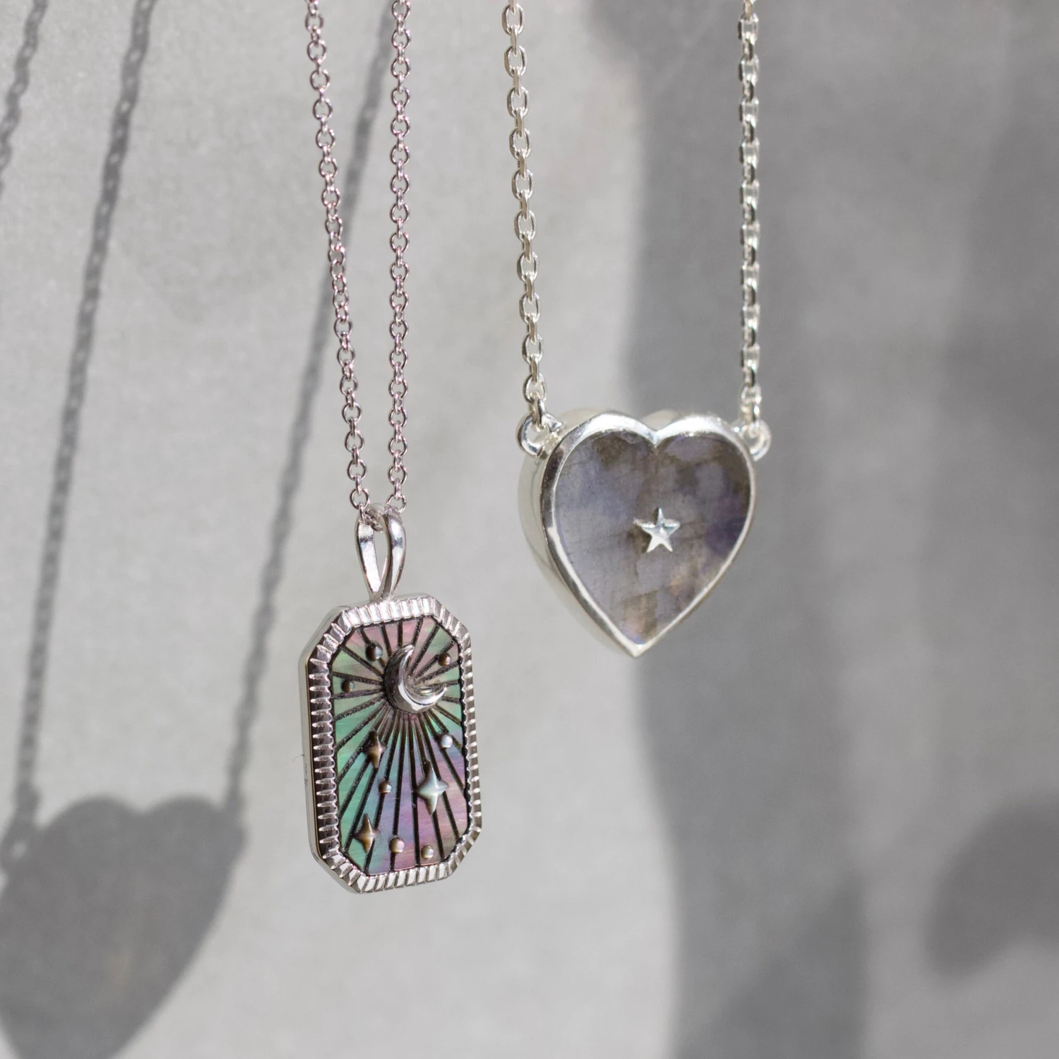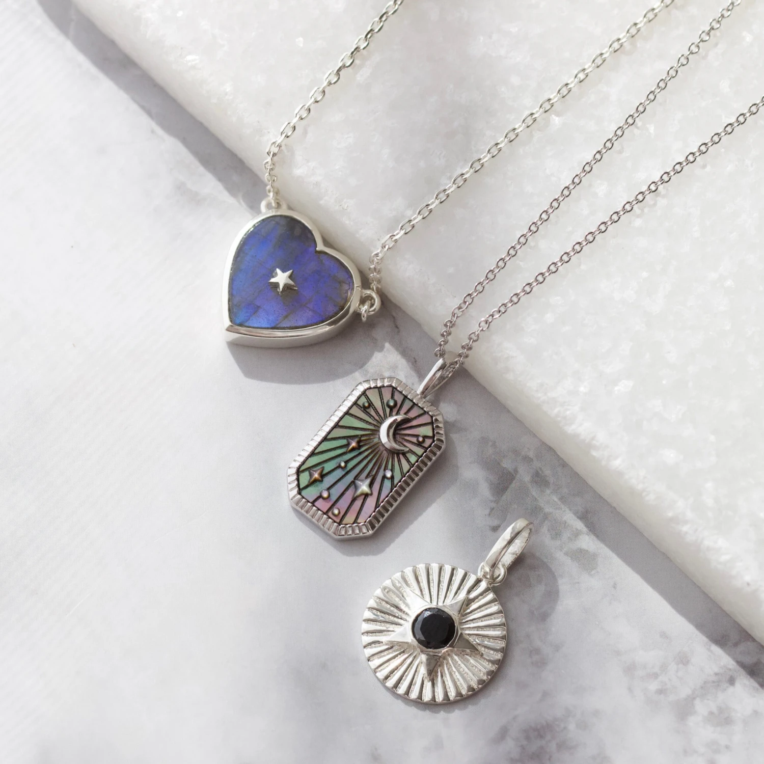 Keep your cards close to your chest! Our tarot card celestial pendant in black mother of pearl shimmers an iridescent glow of green and purple with a beautiful moon beam motif!