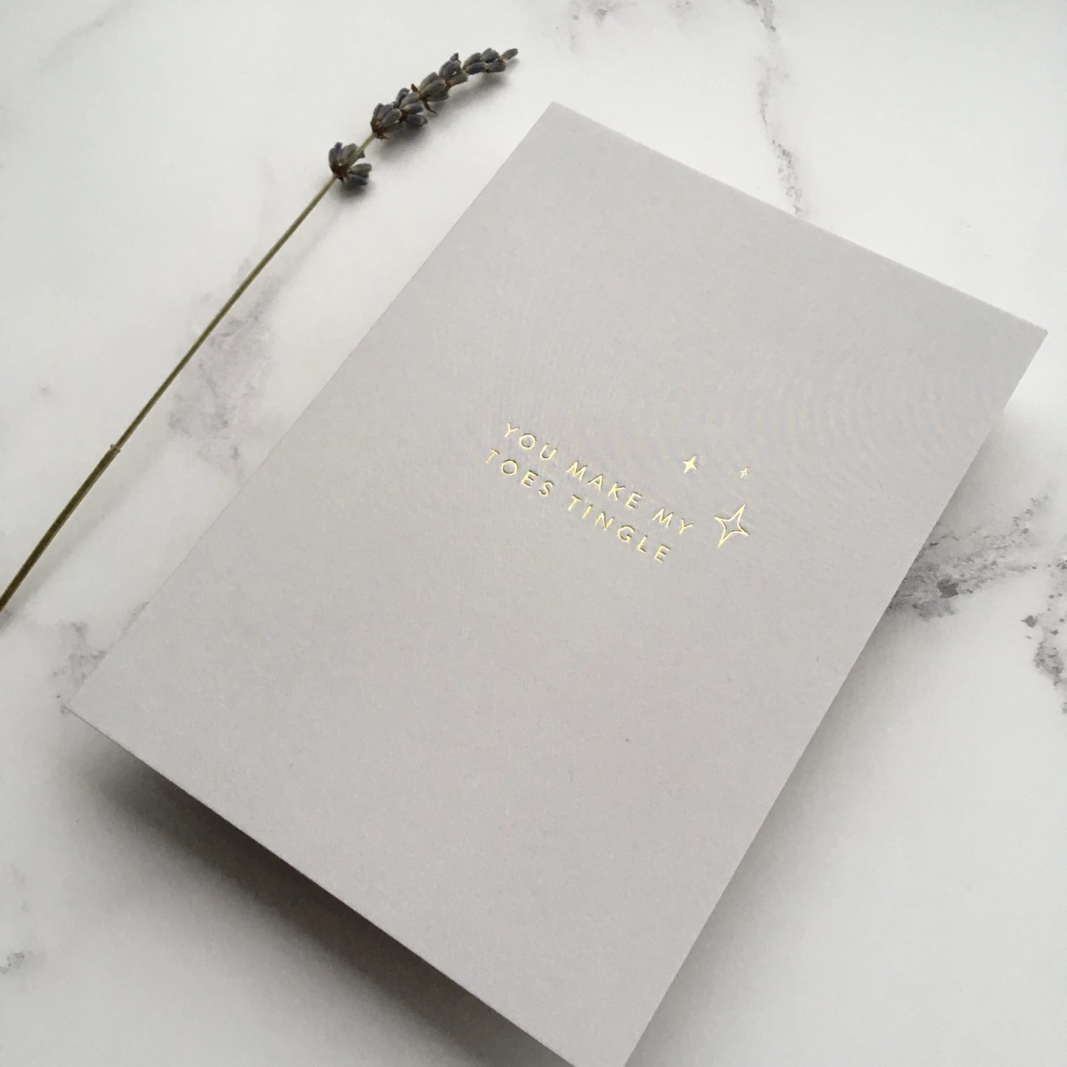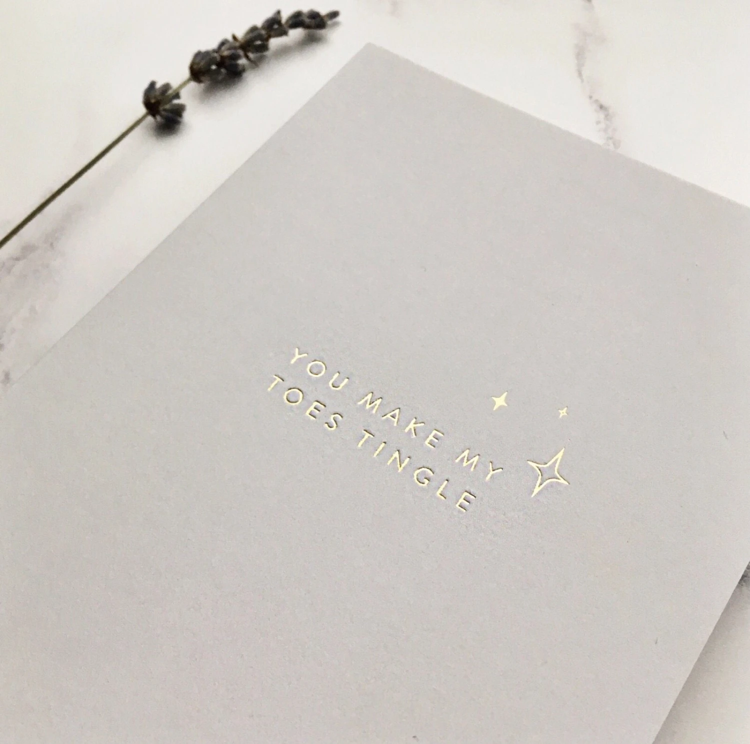 “You Make My Toes Tingle” Card in gold foil on a grey background.Â