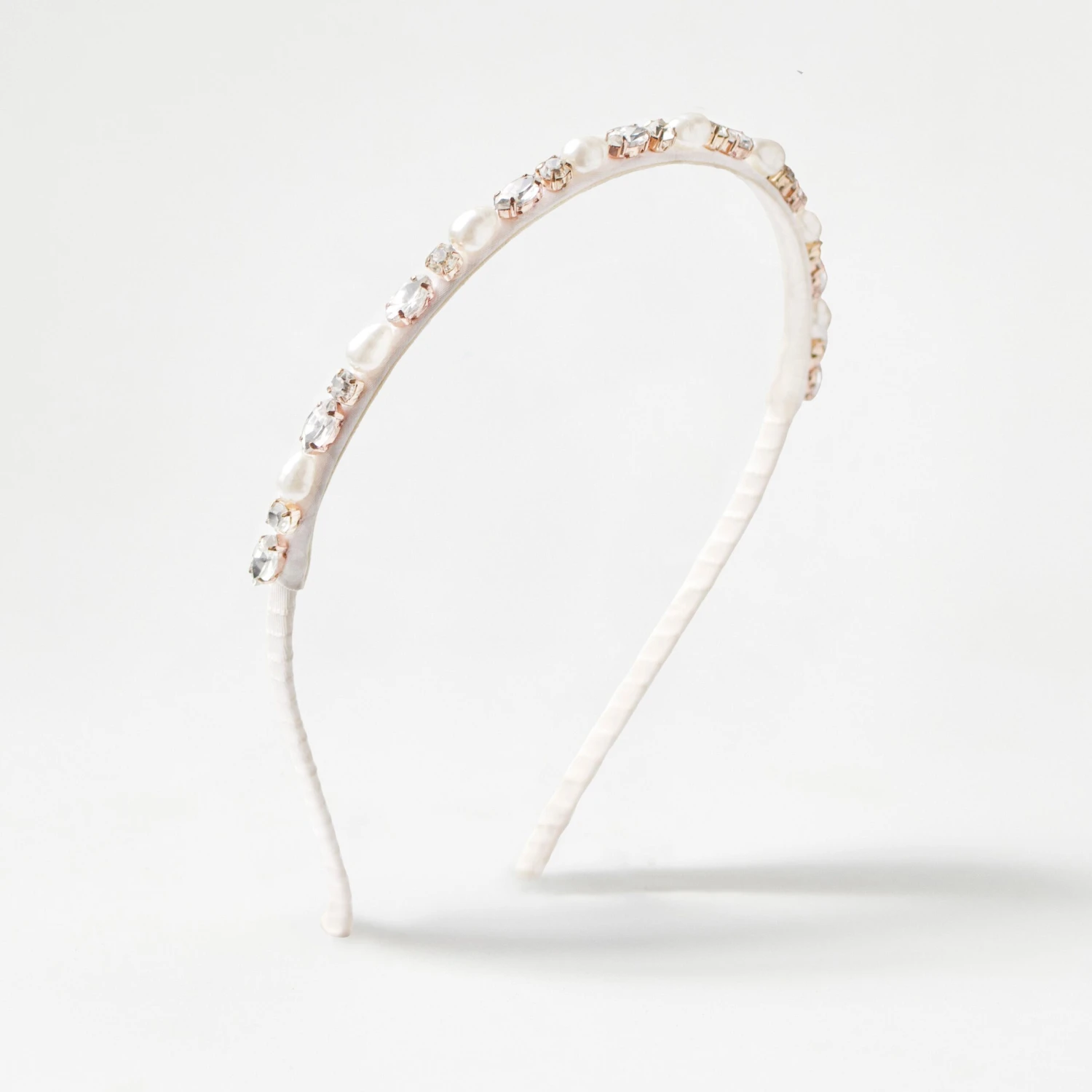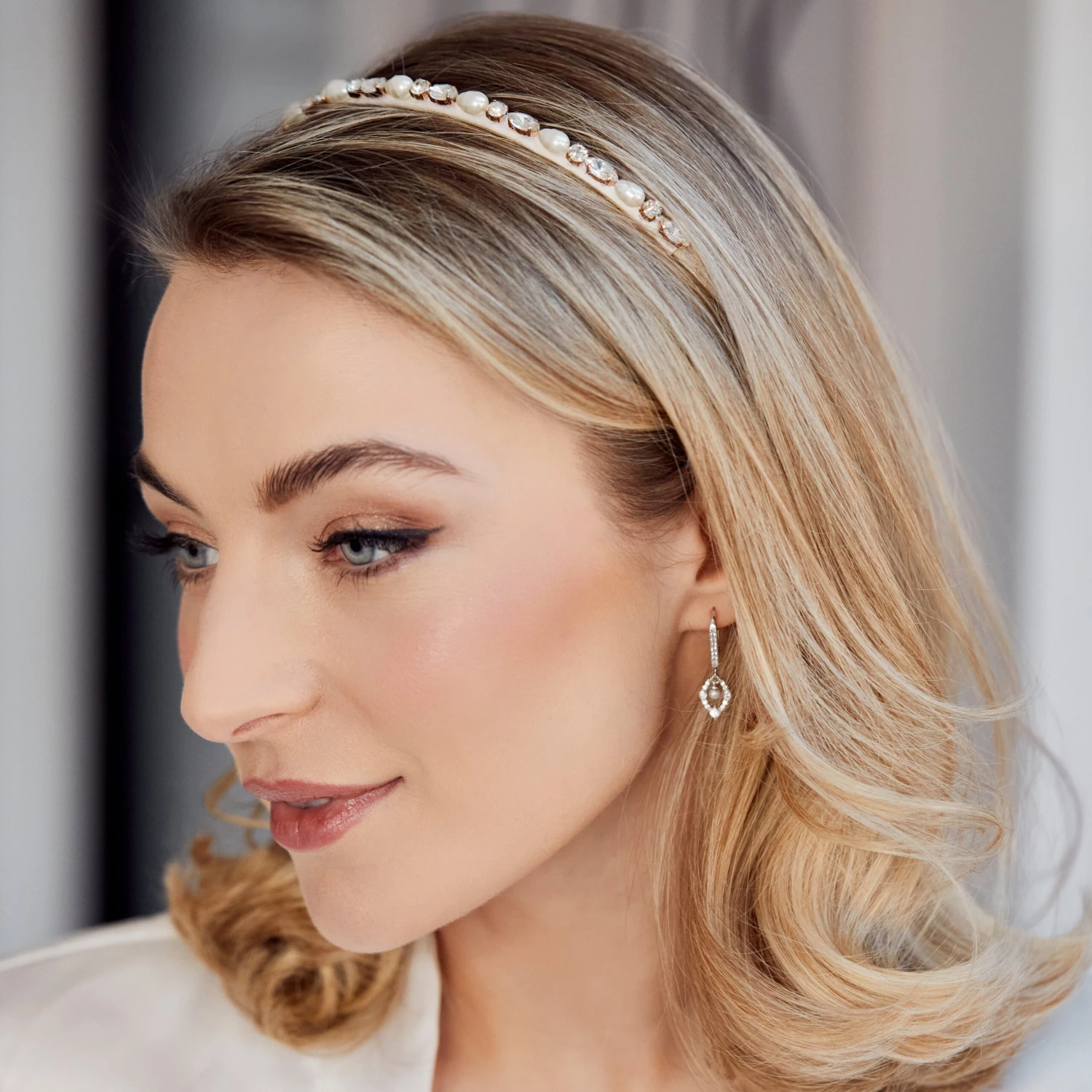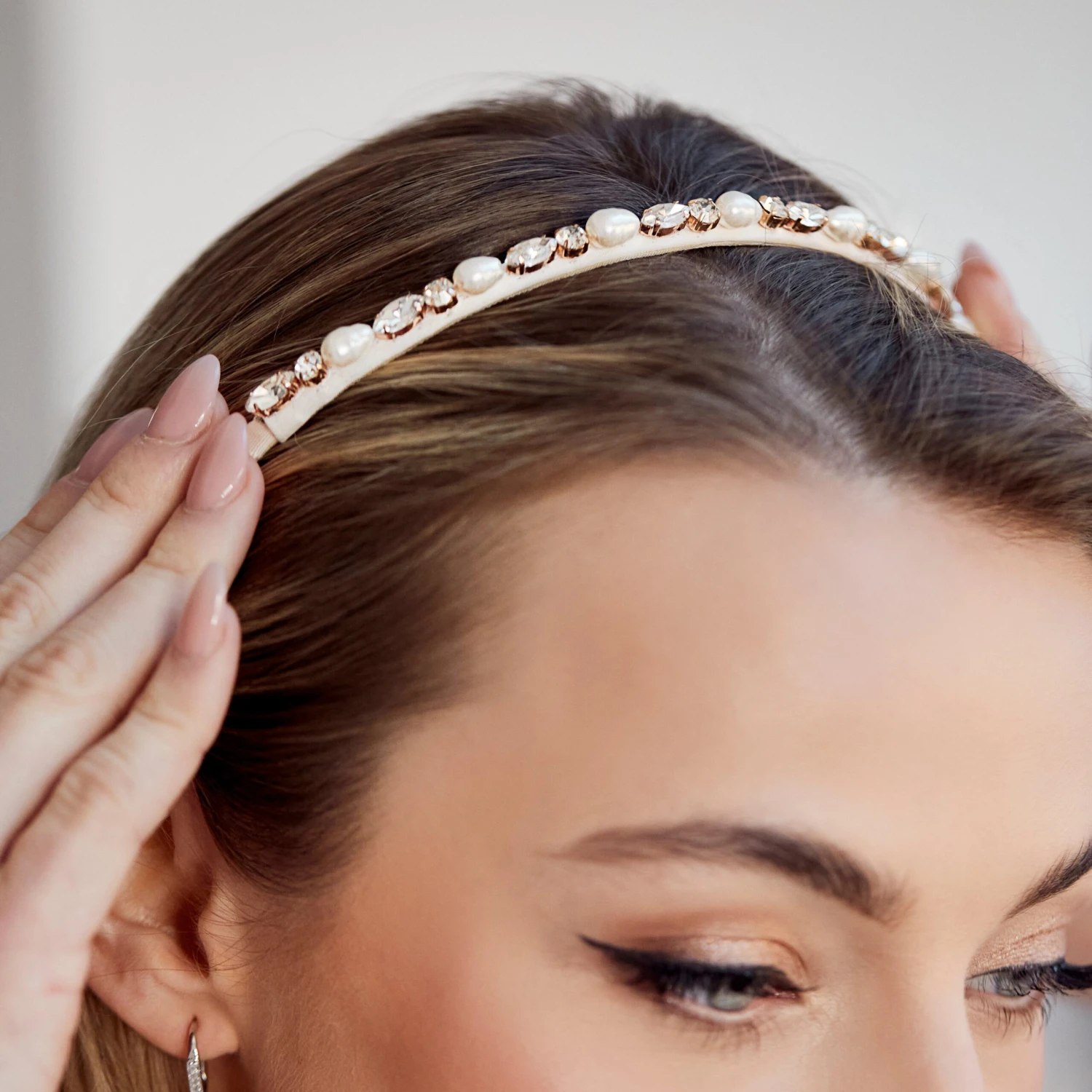 Our Chloe hairband with pearl and crystal gemstones is simple, timeless and elegant!Â