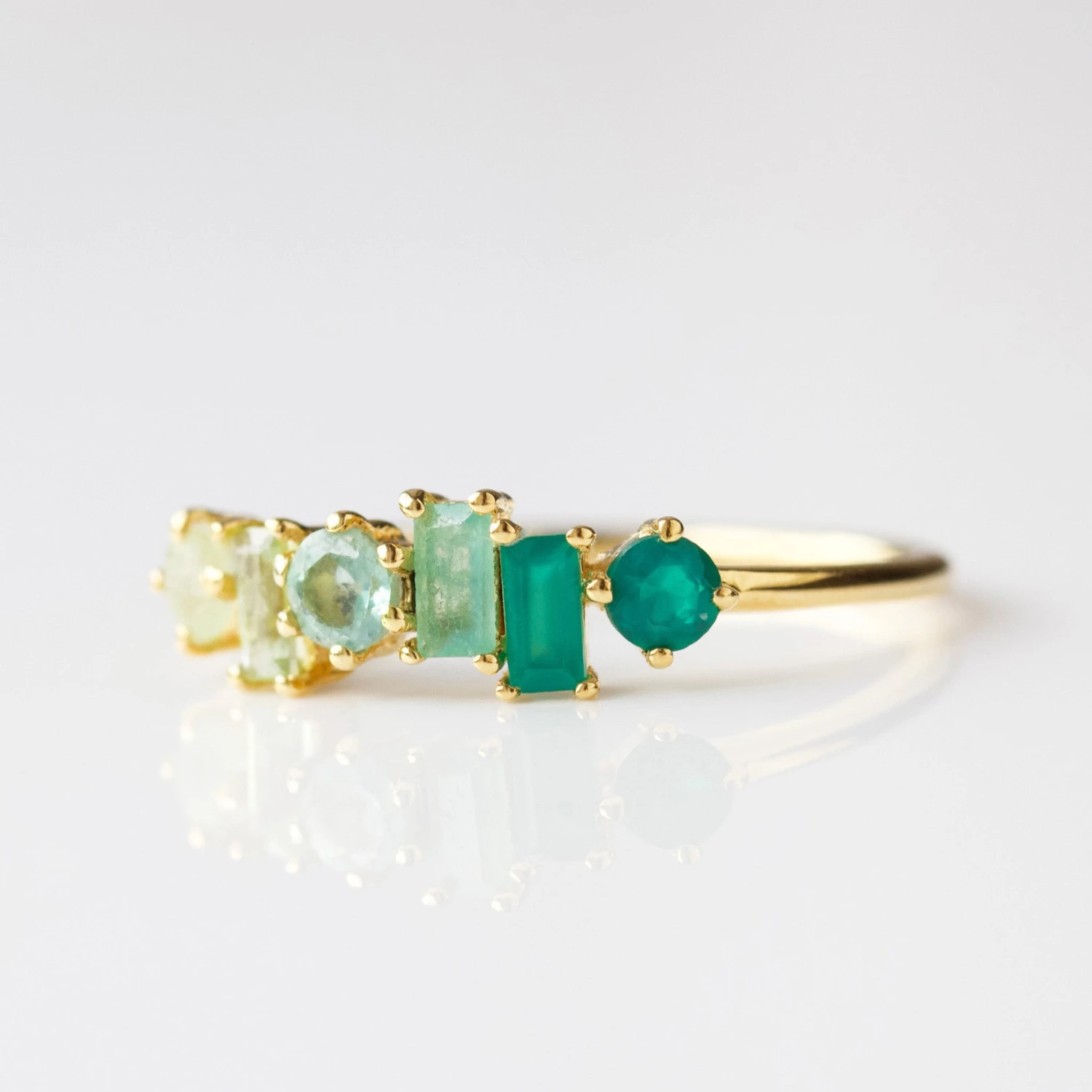 A myriad of sparkling, green gemstones in mesmerising ombre colours make up this must have ring!