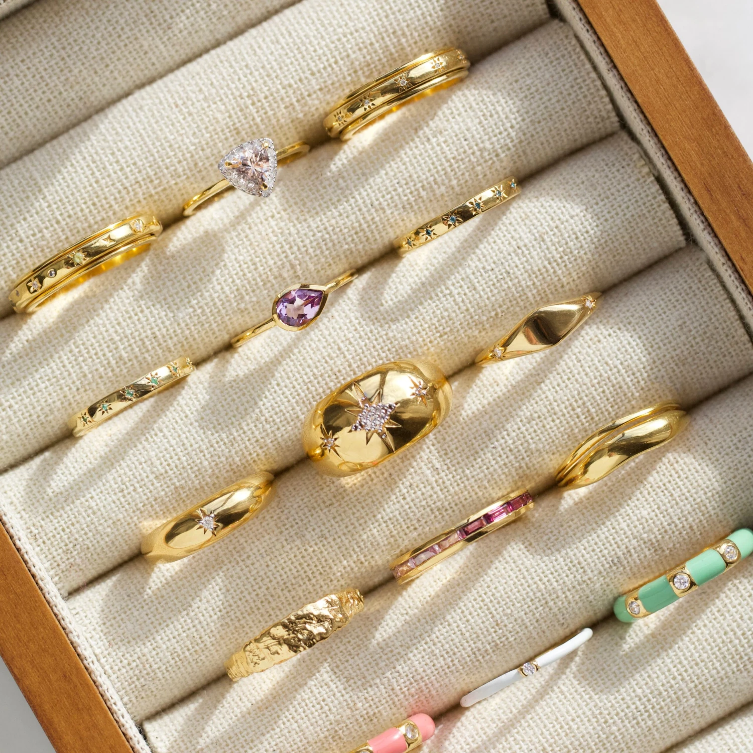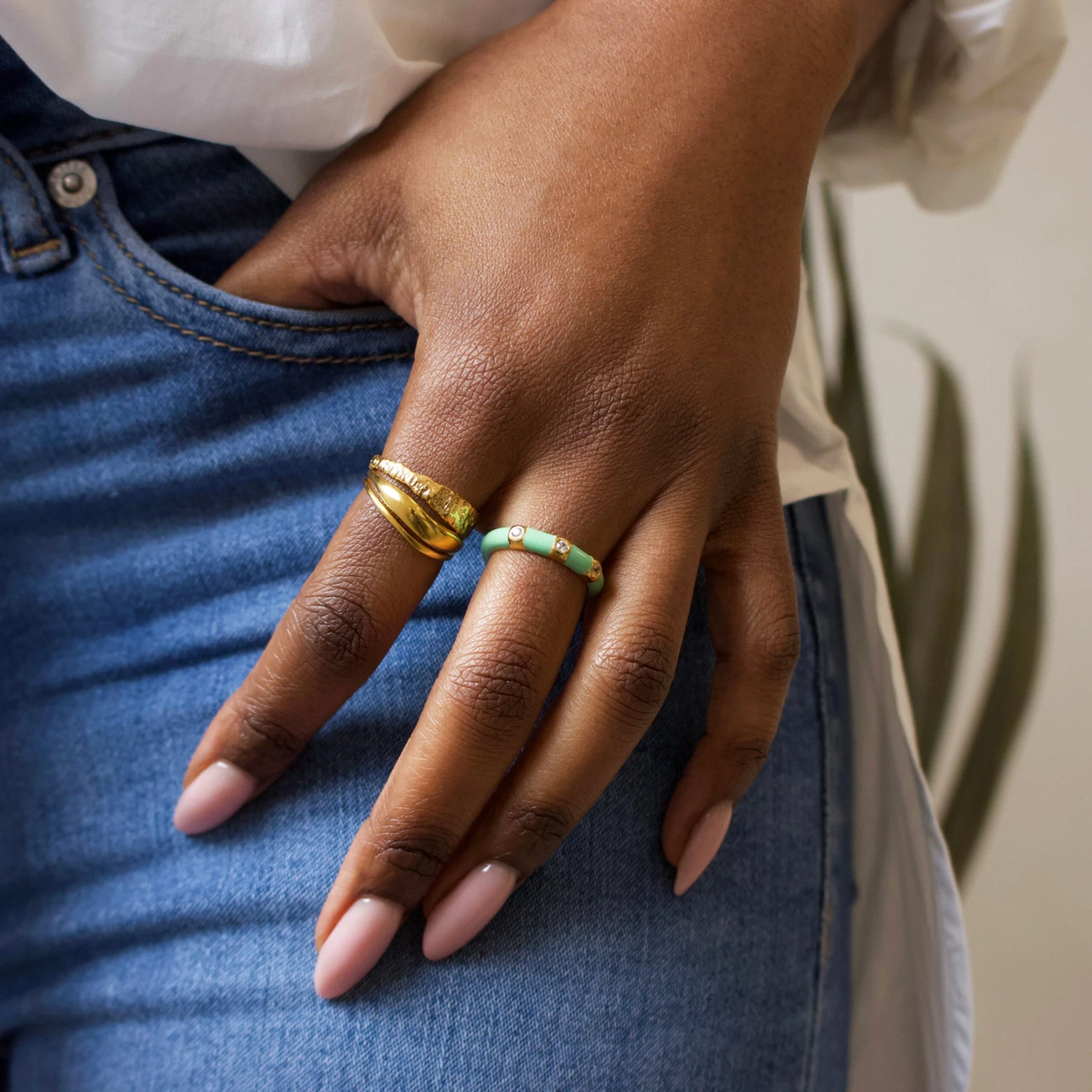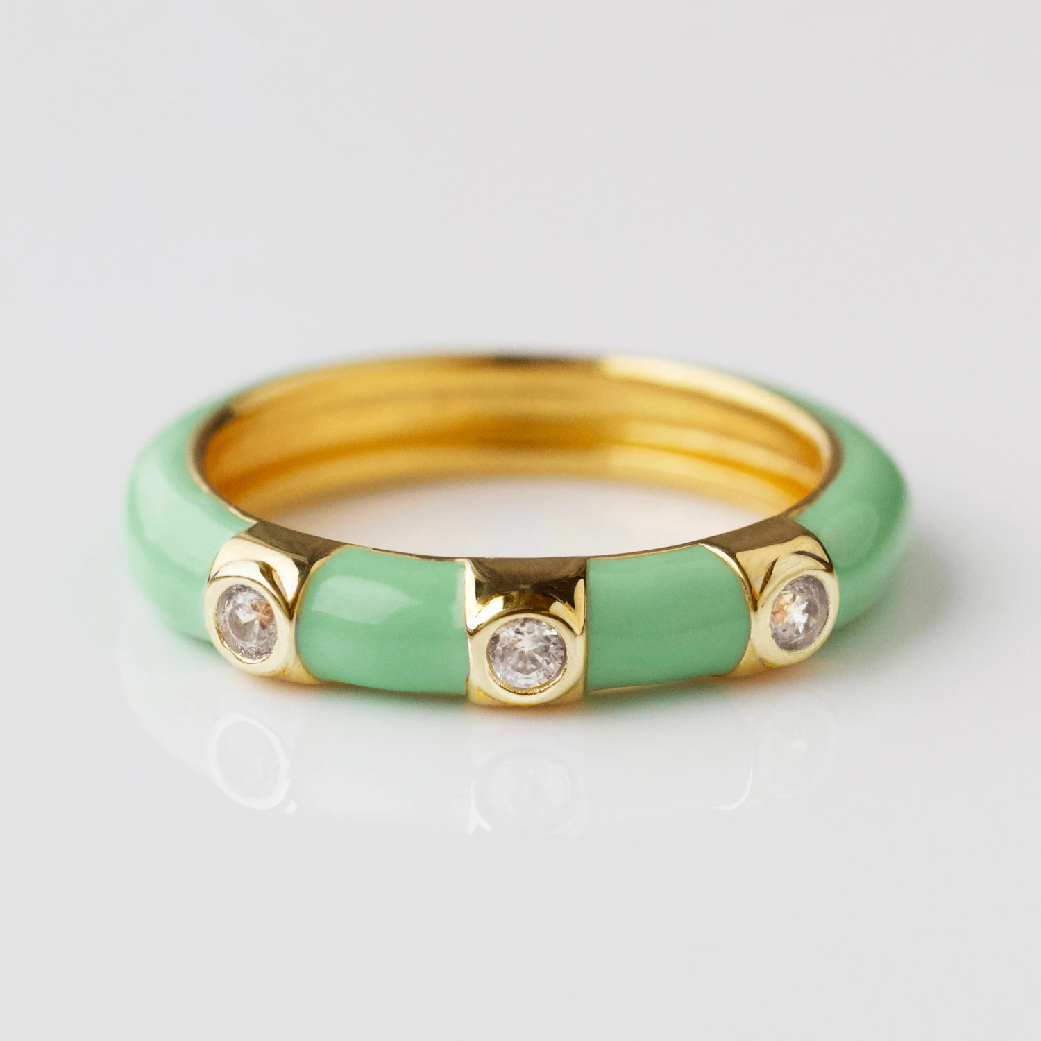 Add a splash of summer to your stack with our Harper enamel band! Beautifully faceted natural zircon stones sparkle against a mint enamel band.Â