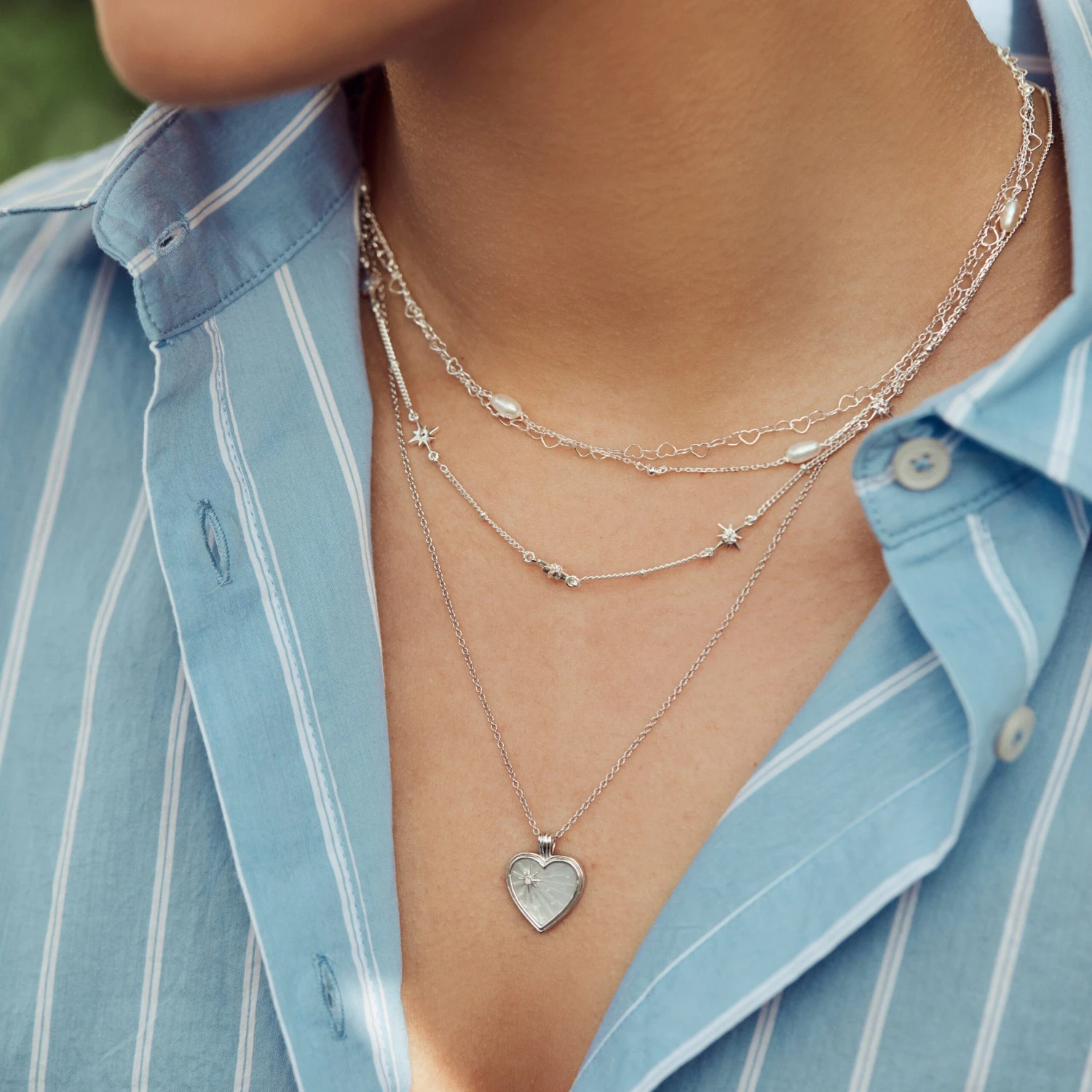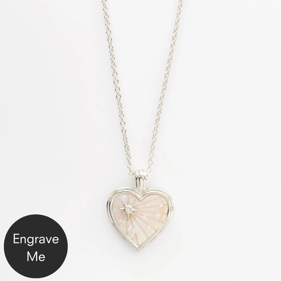 Our heart shaped celestial pendant in mother of pearl shimmers an iridescent glow of blue and pink with a diamond star ray motif!