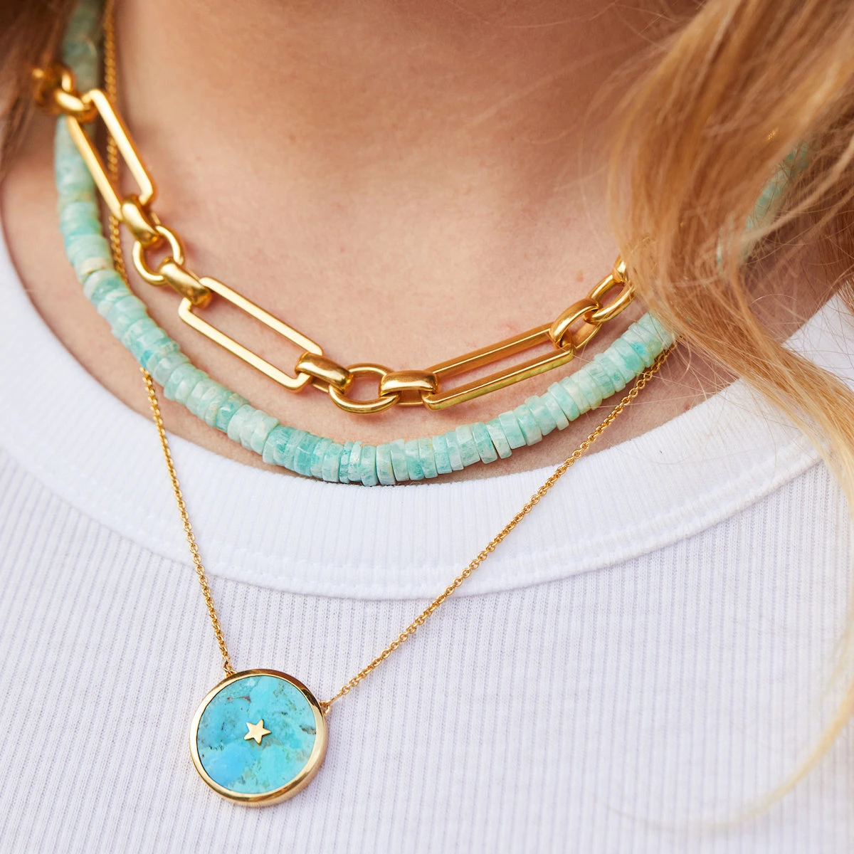 Add a splash of colour to your layers with this summers must have statement amazonite beads! Each natural cut stone has beautiful natural marbling meaning each necklace is beautifully unique.