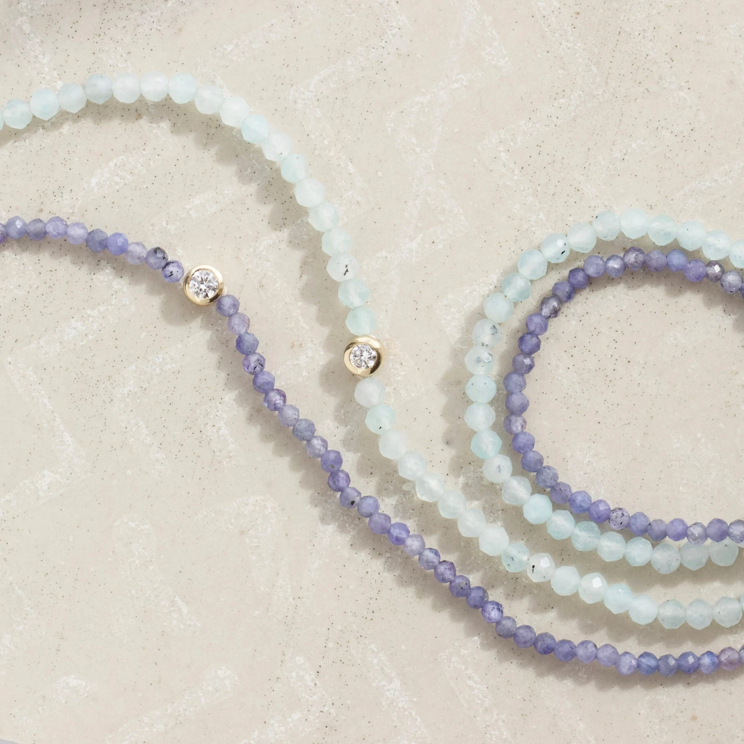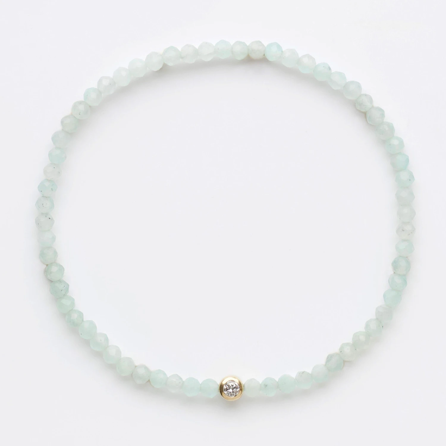 A sparkling white CVD diamond takes centre stage amongst mesmerising milky blue faceted amazonite beads in our stunning stretch bracelet!Â