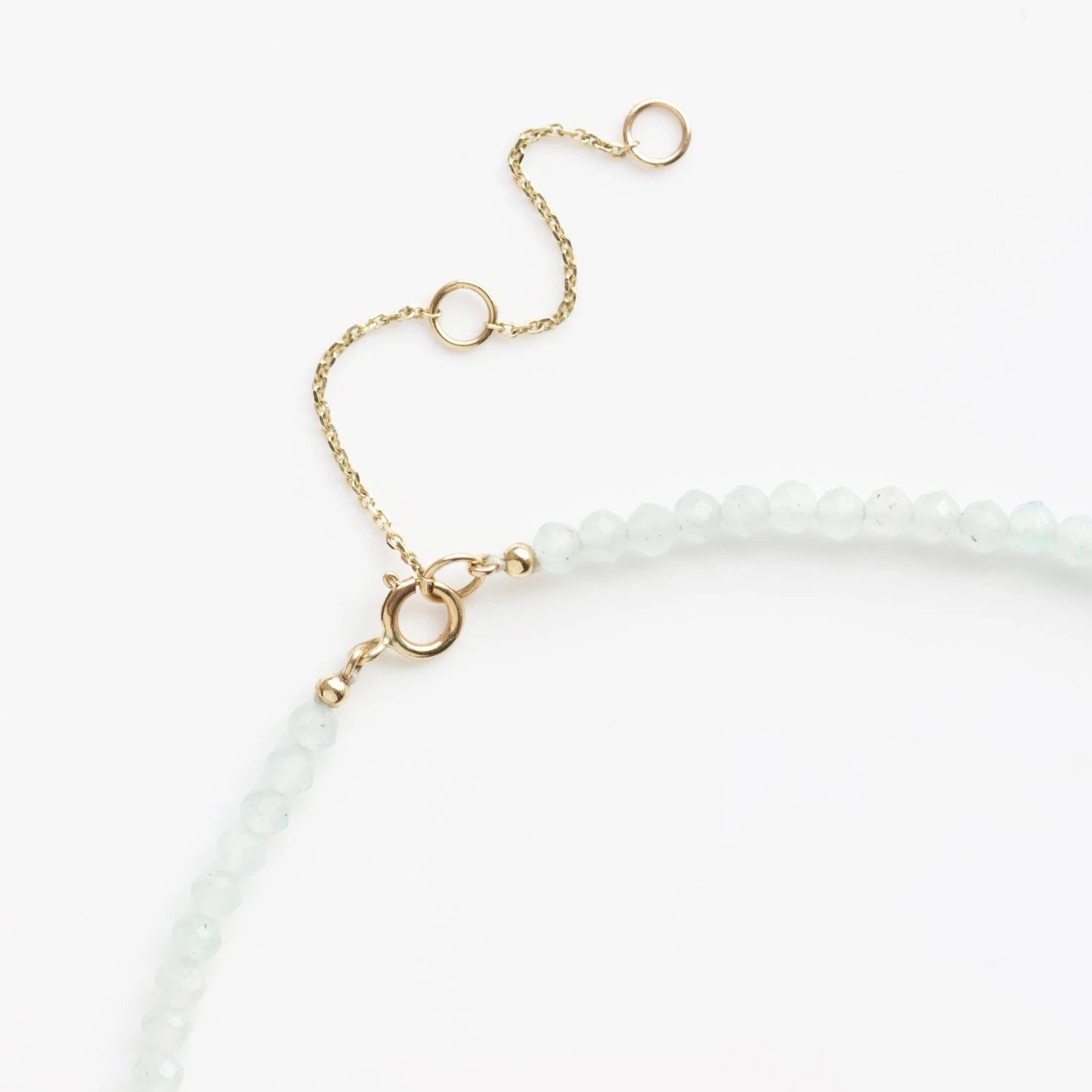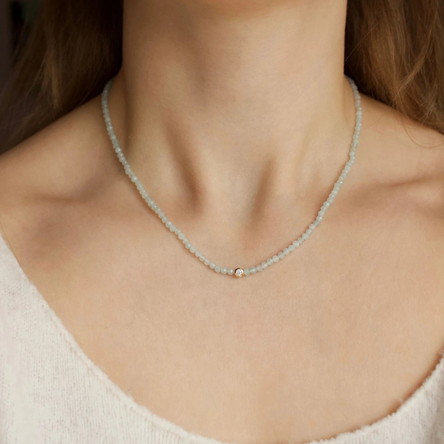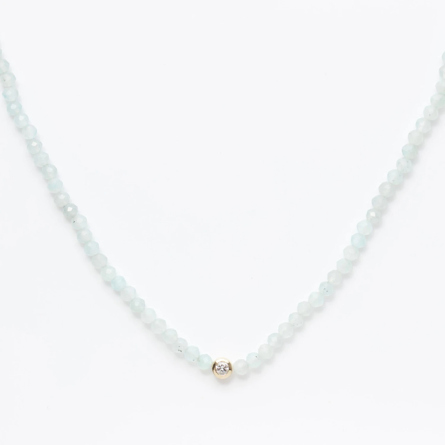 A sparkling white CVD diamond takes centre stage amongst mesmerising milky blue faceted amazonite beads!