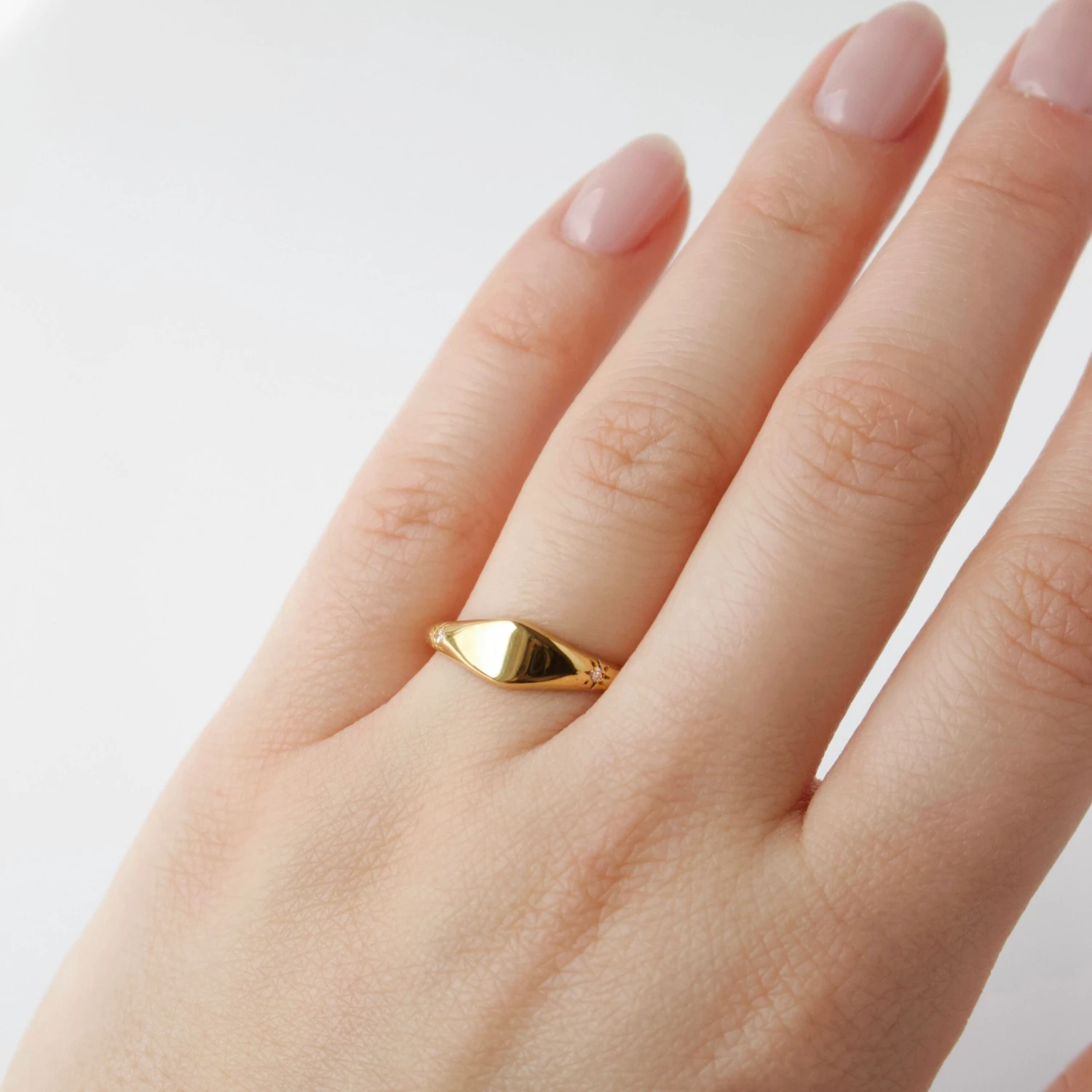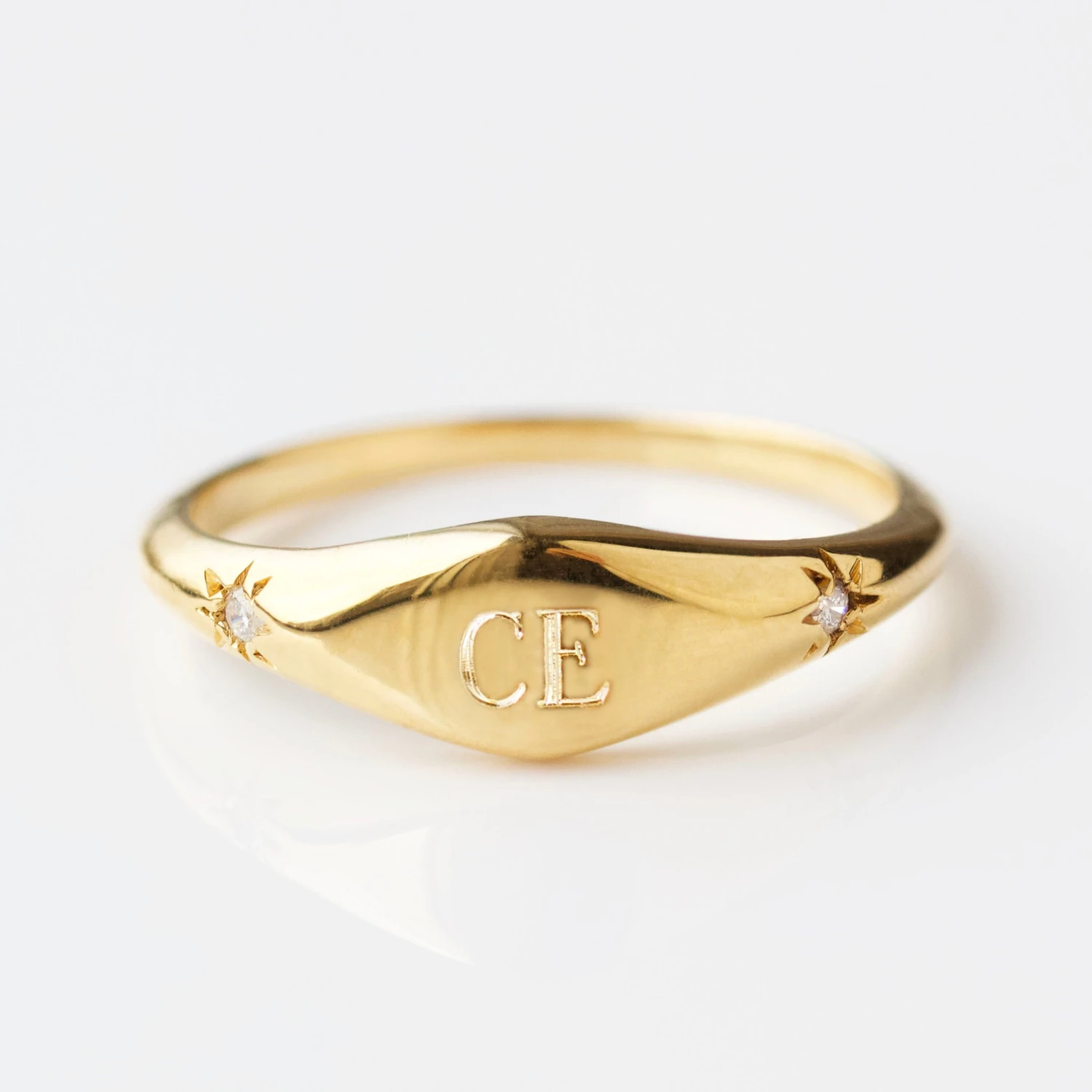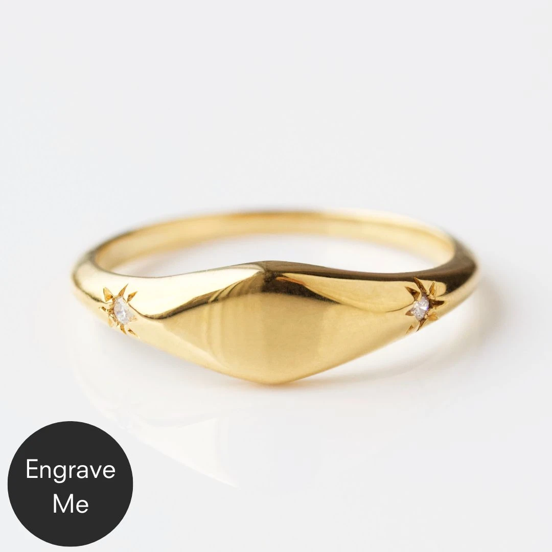 Our engravable signet ring with two sparkling star set diamonds is the perfect personalised piece for your jewellery box.Â